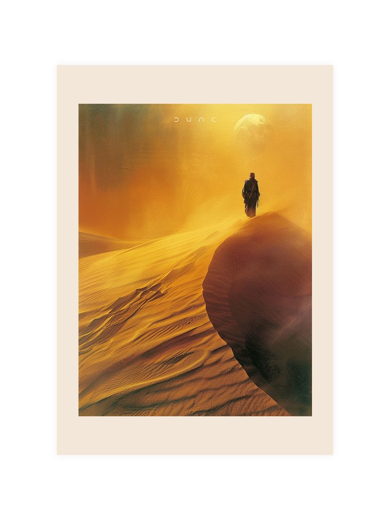 Delve into the world of Dune with the breathtaking Dune Desert Poster, a tribute to the legendary desert planet, Arrakis. This poster immortalizes the journey of the lone wanderer amidst the expansive dunes, under Arrakis' celestial guardians. Transform your space with this piece of art that captures the heart of