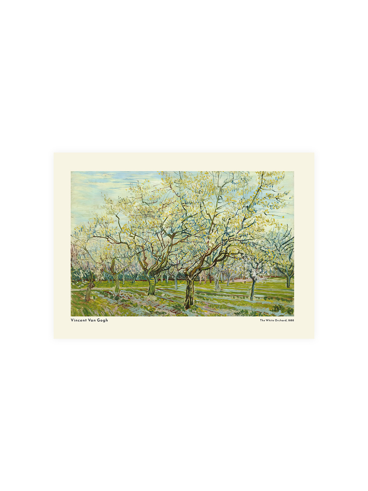 At the center of the poster is a lush, blossoming orchard, with trees stretching upwards towards the sky. Van Gogh’s masterful use of color brings the scene to life, as vibrant hues of green, white, and touches of yellow dance across the canvas.